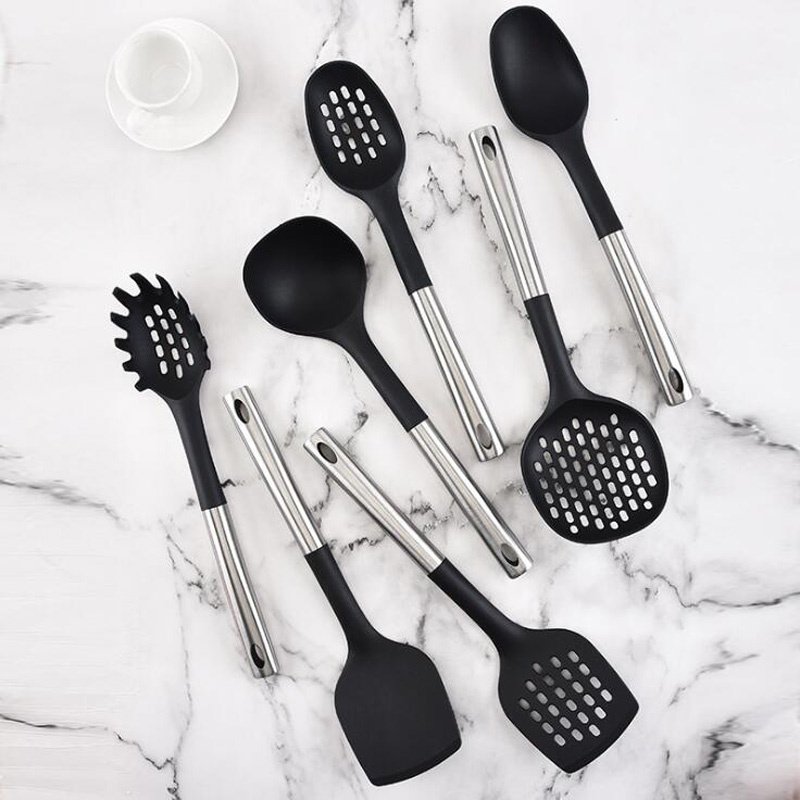 2.Cooking tools are included in this handy 7-piece kitchen tool set: Slotted Turner, Serving Spoon, Slotted Spoon, Spaghetti Fork, Skimmer, Ladle, Spatula.